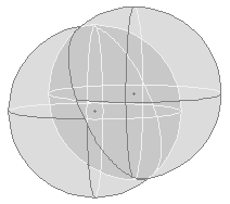 Zwei Kugeln sp1 und sp2 gelten als gleich, wenn ihre Mittelpunkte übereinstimmen (sp1.p==sp2.p) und ihre Radien gleich sind (sp1.r==sp2.r). Für die Kugeln im nachfolgenden Bild liefert der Operator == den Wert true, der Operator != den Wert false. | |